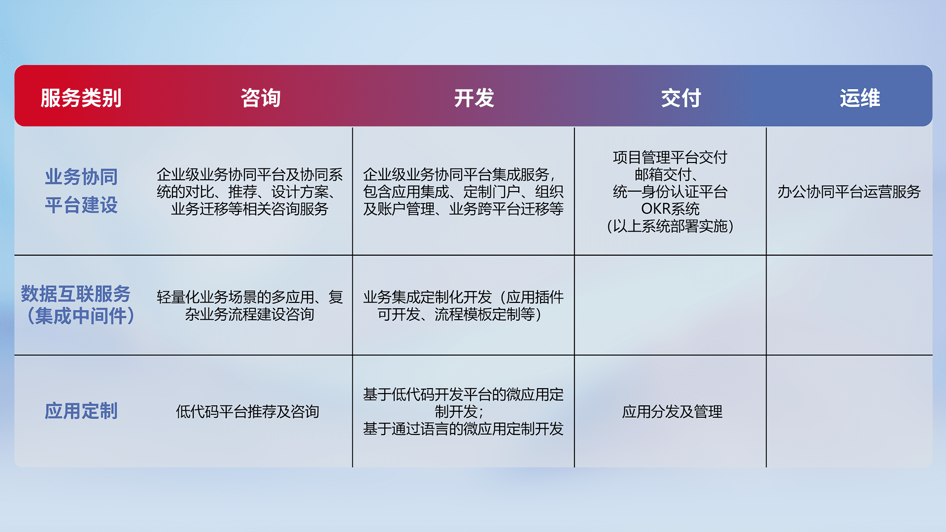 针对钉钉、、、企微、、IDaas等平台级产品提供产品的规划、、方案、、交付、、、定制化开发等服务,,,,实现如统一协同办公、、、智能客户服务、、混合会议管理、、、智能数据查询、、等业务场景,,实现数字化转型。。