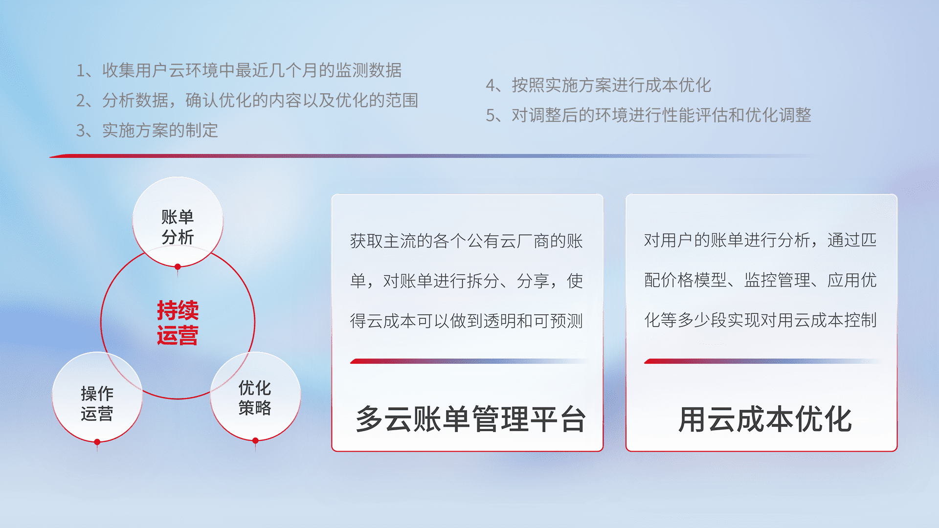 通过多云纳管,,,,以统一的资源数据模型把客户的云资源进行抽象和封装,,,,进而实现对多云资源的统一操作,,,保障云资源管理的可靠性、、、、稳定性与可用性。。量身定制化运维内容,,配置、、开发运维、、补丁管理、、、、备份、、、、监控、、、、认证和访问管理、、审计和日常巡检等,,,,保障在用云过程中的可靠度,,稳定度以及高可用率。。。